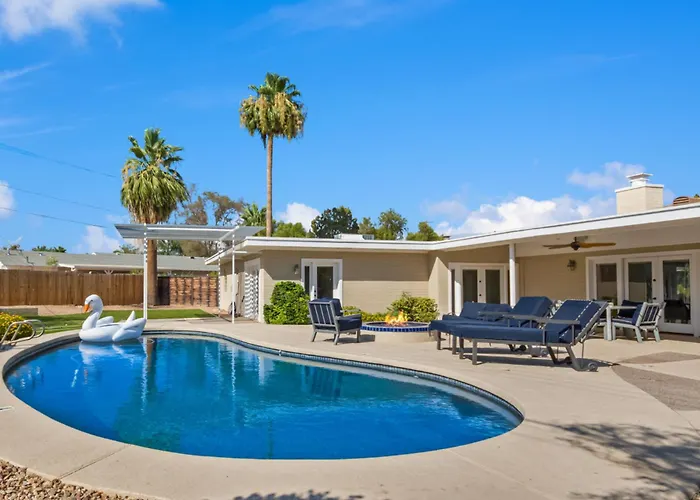 Situada en el distrito Centro histórico de Scottsdale, la casa de vacaciones está justo al lado de la parada de autobús Scottsdale Rd & Chaparral Rd. Los huéspedes pueden visitar G R Herberger Park, que está a unos 10 minutos en coche de esta villa, o visitar la Cabeza del Sendero Cholla del Monte Camelback, que está a 15 minutos en coche.